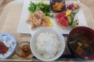 定例会の前に、役員の4人で、市内勝沼町の「あかり食堂」さんへ。おすすめの「あかり定食」をいただきました。お店自慢のだし巻き卵、こだわりの唐揚げとお刺身、小鉢のついた定食。とても美味しかったです。