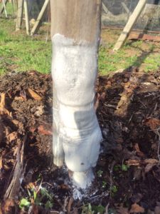 『四季彩屋ひろせ農園』では、「ガットサイド」という薬剤の散布をしました。白い薬剤に少量の水を混ぜて、ぶどうの木の根に近い部分にハケで塗っていきます。私は、今回が初めてでした。